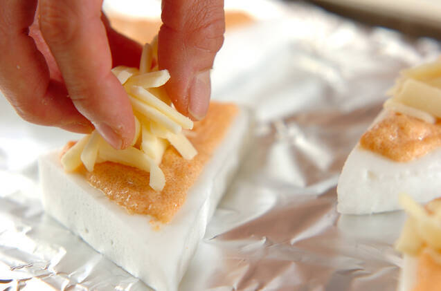 ハンペンに<明太マヨ>ををぬり、ピザ用チーズをのせる。