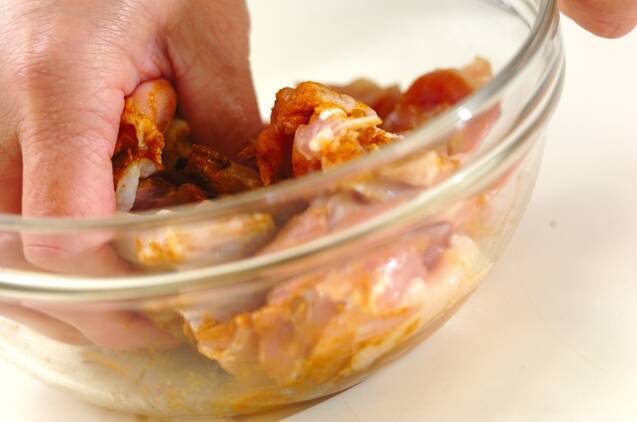 鶏もも肉は食べやすい大きさに切る。ボウルに<下味>の材料を混ぜ合わせ、鶏もも肉を加えてもみ込み、30分程置く。