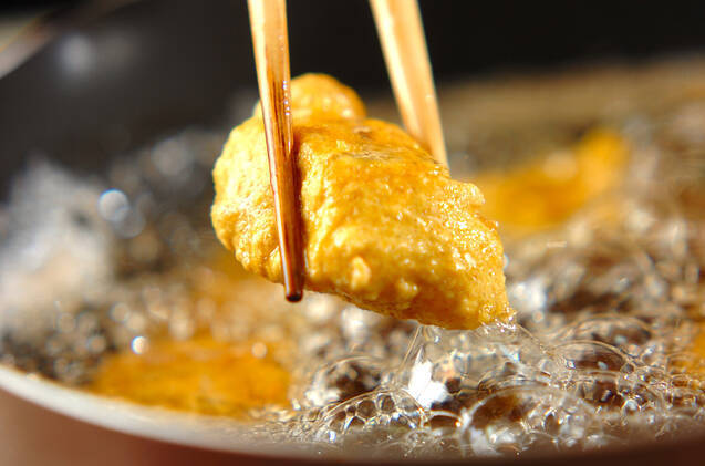 続けて<衣>にタラを通して170℃の揚げ油に入れ、サクッと揚げて油をきる。