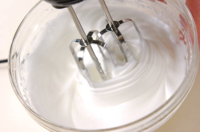 卵白にグラニュー糖を2~3回に分けて加え、泡立ててしっかりしたメレンゲを作る。