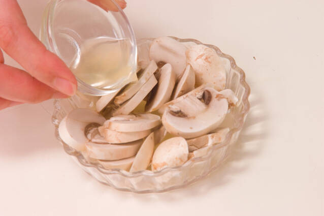 マッシュルームは固く絞ったぬれ布巾で汚れを拭き取り、4~5枚の縦切りにし、レモン汁をからめる。