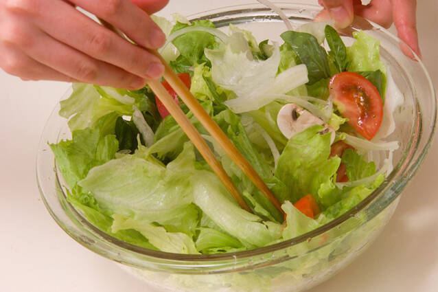 ボウルに野菜類、<ドレッシング>を入れて混ぜ合わせ、器に盛る。