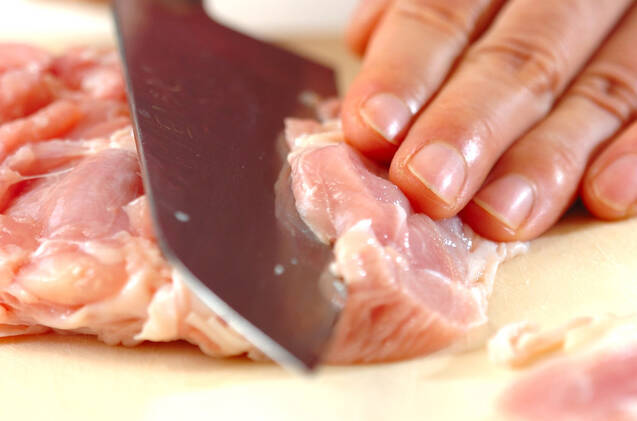 鶏もも肉は余分な脂を取り除き、食べやすい大きさの削ぎ切りにし、塩コショウを振る。