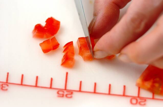 ミディトマトは5mm角に切り、他の<ソースラビゴット>の材料とよく混ぜる。