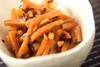 汁気がほとんどなくなれば黒ゴマを加え、全体にからめて器に盛る。
