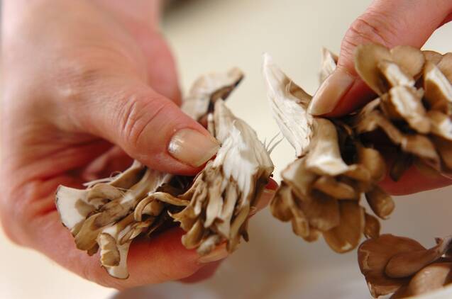 牛肉は1.5cm幅に切る。マイタケは石づきを除いて手でほぐし、1.5cm幅に切る。ショウガの薄切りはせん切りにする。