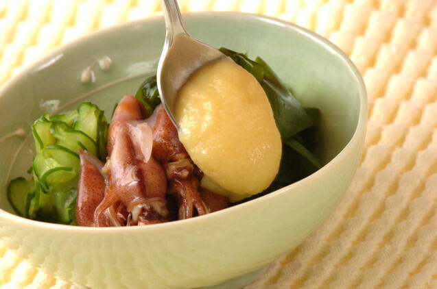 器にホタルイカ、ワカメ、キュウリを盛り付け、<からし酢みそ>をかける。