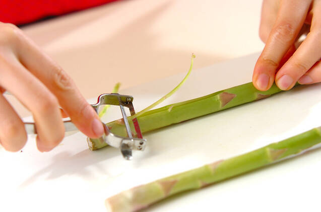 グリーンアスパラはピーラーで皮とハカマを削ぎ取り、茎の付け根のかたい部分を切り落とし、幅3cmの斜め切りにする。シイタケは石づきを切り落とし、笠は幅5mmに切り、軸は縦に裂く。
