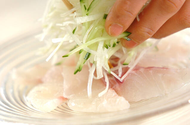 器に鯛と大根、キュウリ、セロリを盛り合わせ、貝われ菜、ピーナッツを散らし、<ドレッシング>をかける。