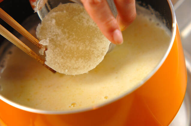 鍋に牛乳、黄桃、砂糖を入れて火にかけ、煮たったら火を止め、ゼラチンを加えて溶かす。