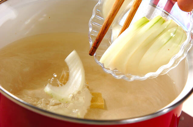 鍋に<スープ>の材料、玉ネギを入れ、強火にかける。