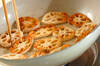 レンコンは皮をむいて5~6mmの厚さの輪切りにし、水に通してしっかり水気をきる。塩コショウを振って、小麦粉を薄くまぶす。