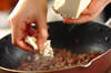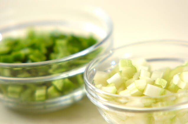 ピーマンは縦半分に切って種とワタを取り、5mm角に切る。