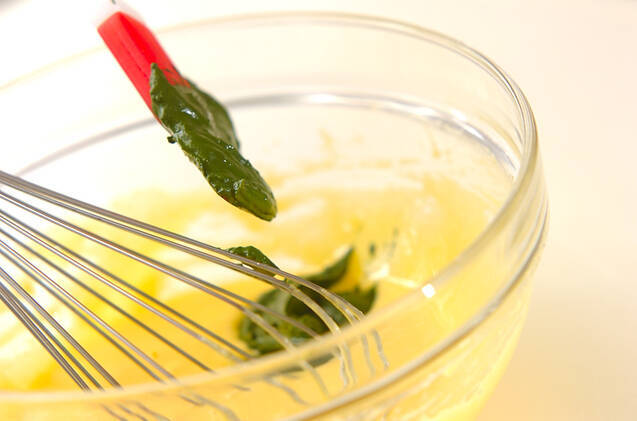 卵黄、グラニュー糖をボウルに入れ白っぽくなるまですり混ぜる。お湯で溶いた抹茶を加え、混ぜ合わせる。