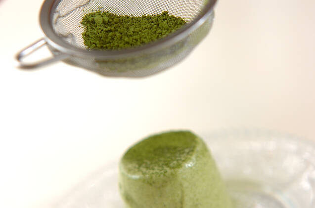 抹茶を振ってでき上がり。抹茶の風味をシンプルに味わうことのできるババロアなので、良質な抹茶を使われることをおすすめします。