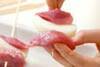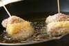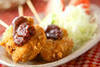 小麦粉、溶き卵、パン粉と衣をつけ、170℃位の揚げ油に入れる。美味しそうな揚げ色がつくまでしっかり揚げ、油をきる。