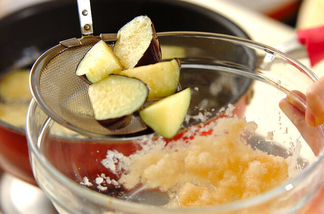 ナスを170℃の揚げ油に入れてサッと揚げ、<おろしダレ>のボウルに加えて混ぜ合わせる。