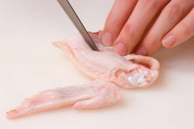 鶏手羽先は水でサッと洗って水気を拭き取り、関節で切り分ける。身の厚い部分に切り込みを入れ、<下味>をからめる。