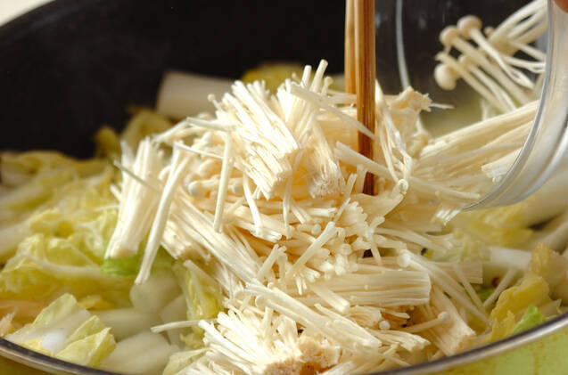 フライパンにゴマ油を熱し、ショウガ、赤唐辛子を炒め、香りがたったら白菜、エノキを加えて炒める。