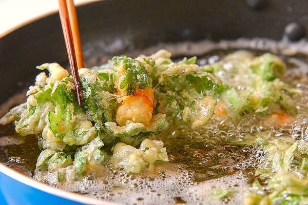 170℃の揚げ油にひとくち大ずつ、バラバラにならないように少し菜ばしで押えながらまとめるように落とし、カリッと揚げる。