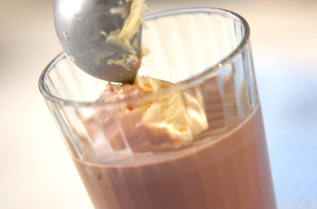 グラスに(2)を注ぎ、バニラアイスクリームをのせ、分量外のココアパウダーを振る。