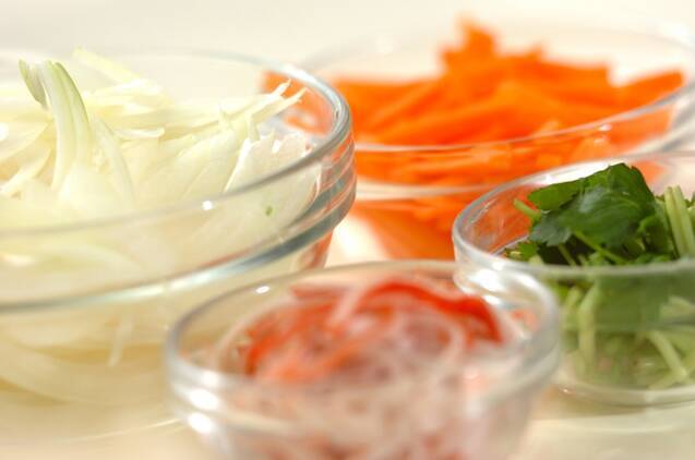 玉ネギは薄切りにする。ニンジンは皮をむき、細切りにする。ミツバは根を切り落とし、長さ2cmに切る。カニ風味カマボコはほぐす。