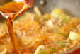 <水溶き片栗>を回し入れ、トロミがつけば、ゴマ油を加え、ひと混ぜして器によそう。