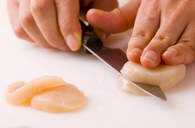 ホタテ貝柱は厚みを2~3等分にする。