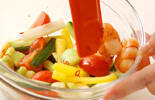 <エスニックサラダ>を作る。エビは殻をむき背ワタを取って塩を入れた熱湯でゆで、水に取りザルに上げる。セロリは筋を引いて、キュウリとスティックに切り、黄パプリカも大きさを合わせて切る。ソラ豆は塩を入れた熱湯でゆでザルに上げ、薄皮をむく。プチトマトはへたを取り水洗いし縦4つに切り、<合わせダレ>と合わせる。