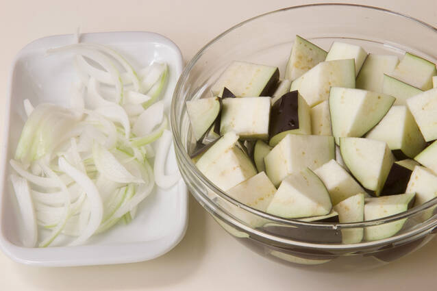 ナスはヘタを切り落として縦4つに切り、2cmの長さに切る。