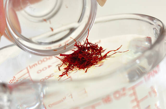 ジャガイモは皮ごときれいに洗い、ラップに包んで電子レンジで1~2分加熱し、少し柔らかくなったら布巾などで包んで皮をむく。玉ネギは縦半分に切って4つのくし切りにし、ニンジンは皮をむきひとくち大の乱切りにする。セロリは筋を引き、長さ4cmの細切りにし、白ネギは幅1cmに切る。ニンニクは芽を取り、薄切りにする。サフランは水400~500mlにつけておく。