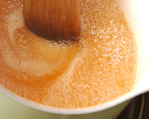 ハンバーグを焼いている間に、<塩ソース>の材料を小鍋に入れ、混ぜながらひと煮立ちさせる。
