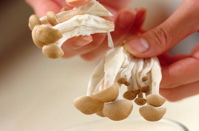 シメジは石づきを切り落とし、小房に分ける。<調味料>の材料を混ぜ合わせる。