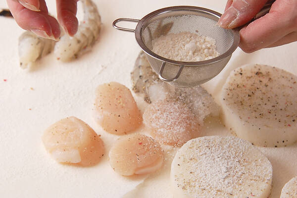 長芋、ホタテ貝柱、エビに塩コショウを振りかけ、薄く小麦粉をからめる。