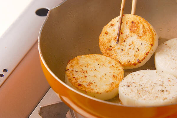 フライパンにオリーブ油を入れ中火にかけ、長芋を並べ入れ、あいたところでシメジをサッと炒め取りだし、長芋は両面にこんがり焼き色がつけば、器に取り出す。