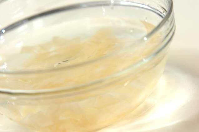 塩クラゲはサッと水洗いして塩を落とし、たっぷりの水につけて塩気を抜き、水気を絞る。袋の指示に従って塩抜きしてください。