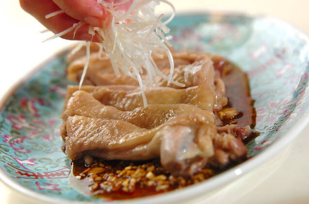 鶏もも肉は、食べやすい大きさに切る。器に、<香味ダレ>を入れて鶏もも肉、水気をきった白髪ネギをのせる。花椒、一味唐辛子を振る。