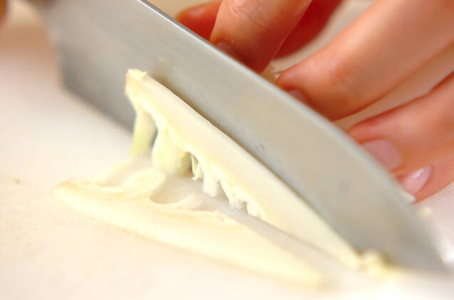 キャベツは幅1cmに切り、芯の部分は薄切りにする。