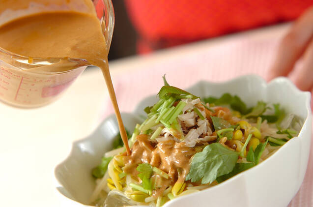 器に氷とうどんを盛り合わせ、ゆでた豆モヤシ、鶏ささ身、ミツバをのせる。<ゴマダレ>をかけ、クコの実と松の実を散らす。※お好みで分量外のラー油や豆板醤を入れてもおいしいですよ。
