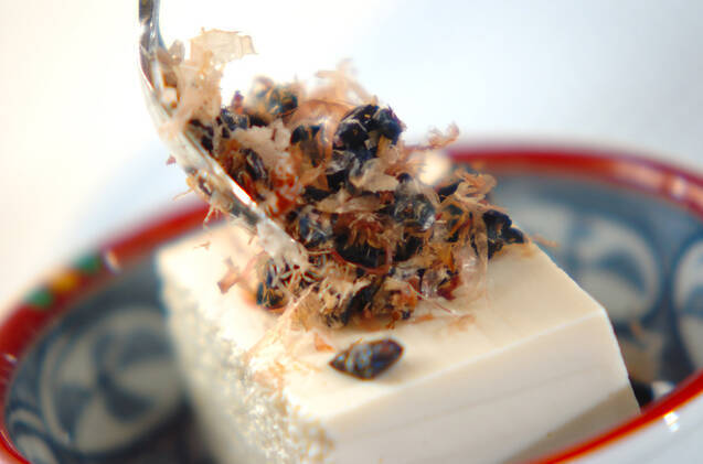 ナスの漬け物とかつお節を混ぜ合わせ、器に盛った豆腐にのせ、<調味料>をかける。
