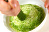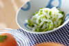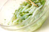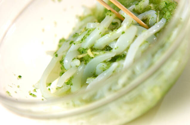 <ショウガ酢>のボウルにイカとキュウリを入れて和え、器に盛り分ける。