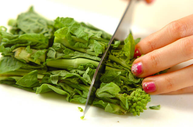 ハマグリは分量外の塩水につけて砂出しをし、殻と殻をこすり合わせて洗い、ザルに上げる。菜の花は根元の部分を切り落とし、長さ3等分に切る。キャベツはザク切りにする。