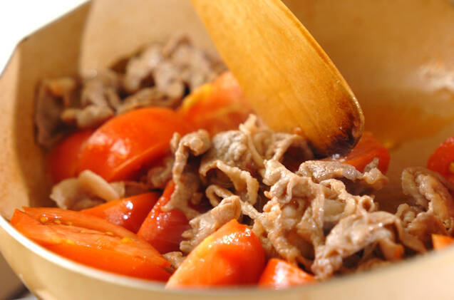 フライパンにサラダ油を中火で熱し、(1)の豚肉を炒める。火が通ったらトマトを加え、しんなりしたらナンプラー適量を加えて炒め合わせる。
