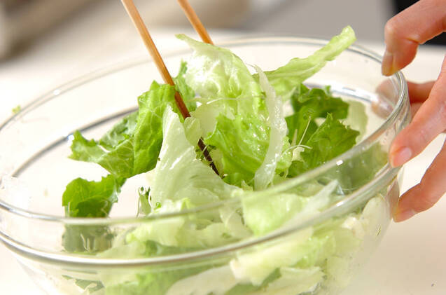 <ドレッシング>のボウルにセロリ、レタス、スプラウトを加えて和え、器に盛る。