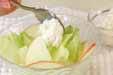 器に水気をきったリンゴとレタス、カッテージチーズを盛り合わせ、よく混ぜ合わせた<ドレッシング>をかける。