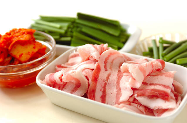 豚バラ肉は長さ6~7cmに切る。白菜キムチが大きい場合は、ザク切りにする。ニラは水洗いして根元の固い部分を切り落とし、長さ5cmに切る。ニンニクの芽は長さ4~5cmに切る。