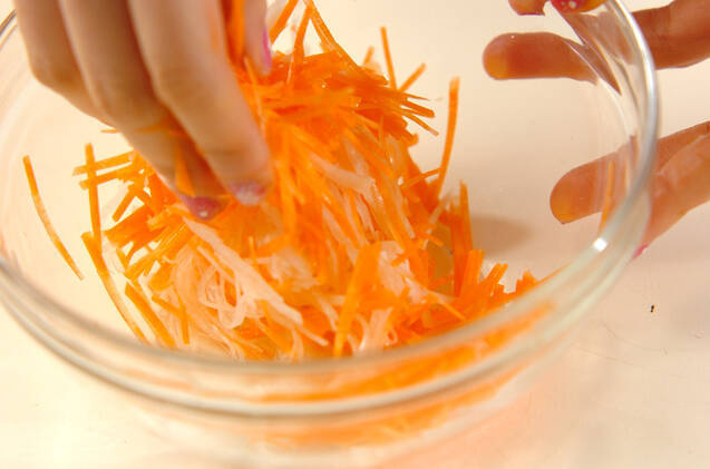 ボウルに大根と塩を入れ、軽くもんでしんなりさせ、ニンジンを加えてさらにもむ。10分位おいて水気が出たら、しっかり水気を絞る。