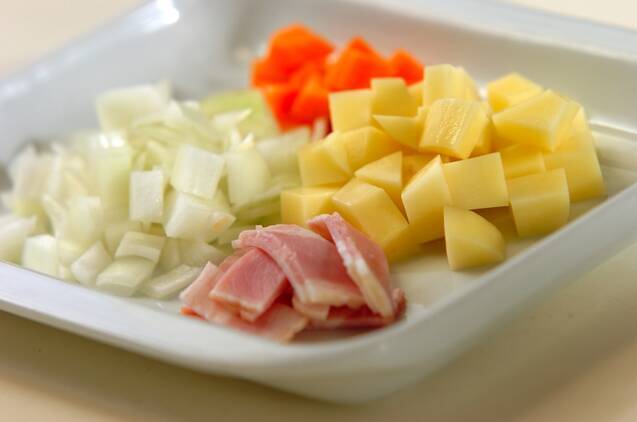 ジャガイモ、ニンジン、玉ネギは皮をむき、1cm角に切る。