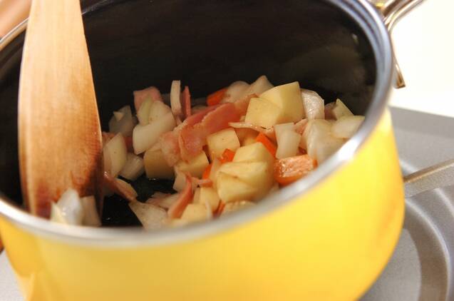 鍋にバターを入れて中火にかけ、ベーコンを炒める。ベーコンから脂が出てくれば、ジャガイモ、ニンジン、玉ネギを加えて炒め合わせる。