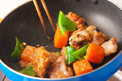 <合わせ調味料>を加えてからめながら炒め、キャベツを敷いた器に盛る。